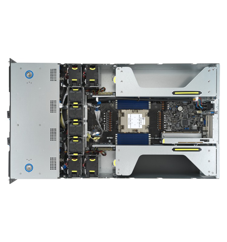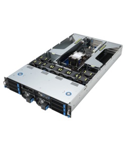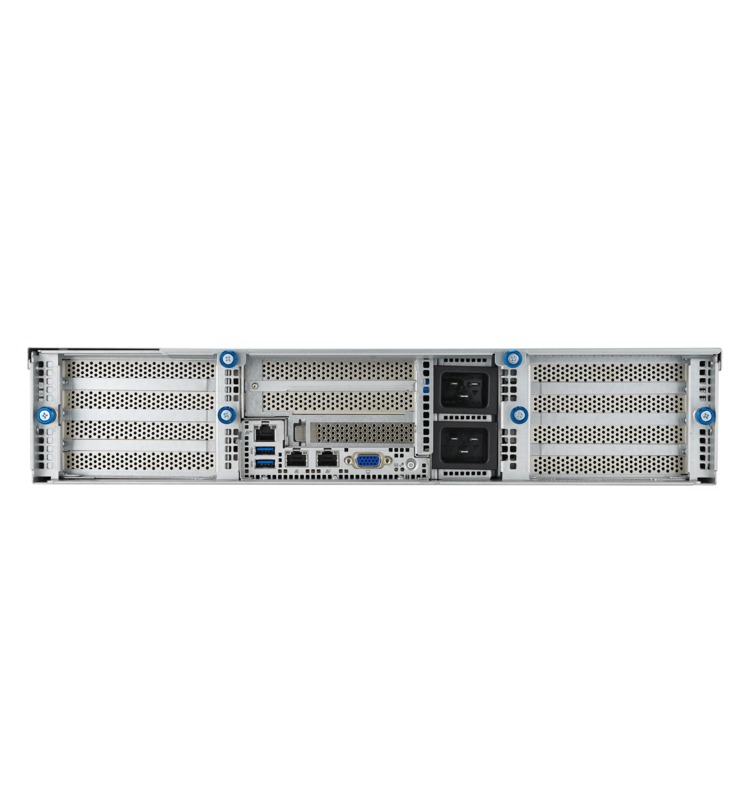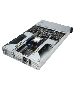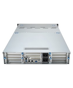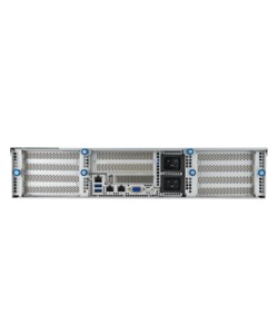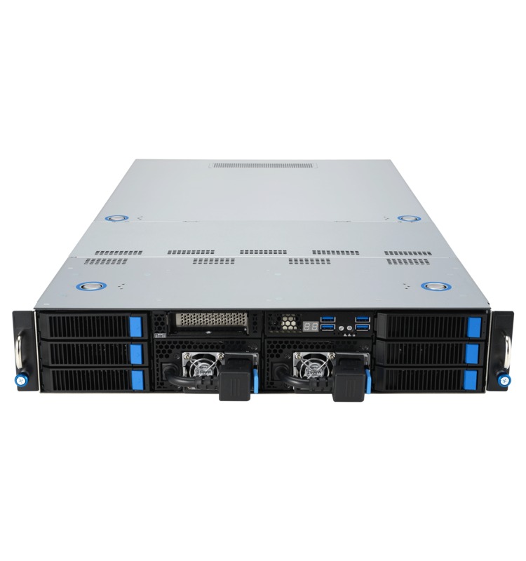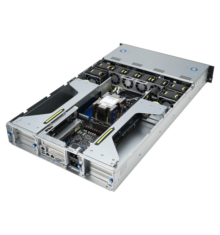 AMD’s EYPC line of processors are built for demanding server workloads, offering up to 128 cores with support for 12 DDR5 memory channels and 128 PCIe Gen 5 lanes. This server uses that processor to enable up to four dual-width GPUs in a compact 2U chassis. Several hot-swap drive bays are easily accessible on the front, along with redundant power supplies and four USB ports. Additional USB ports and networking jacks are located in the rear.