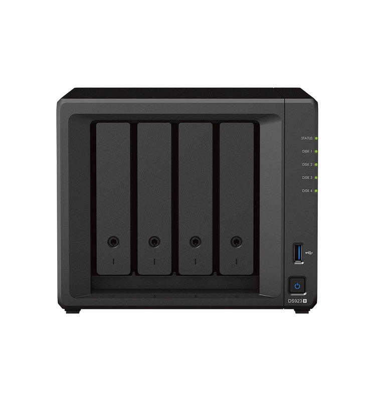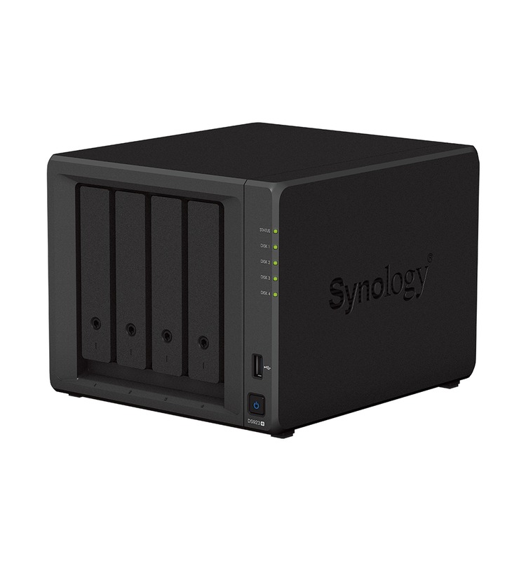 The Synology DiskStation DS923+ is a compact network-attached storage (NAS) system with four hard drive bays and two M.2 slots for optional cache SSDs.