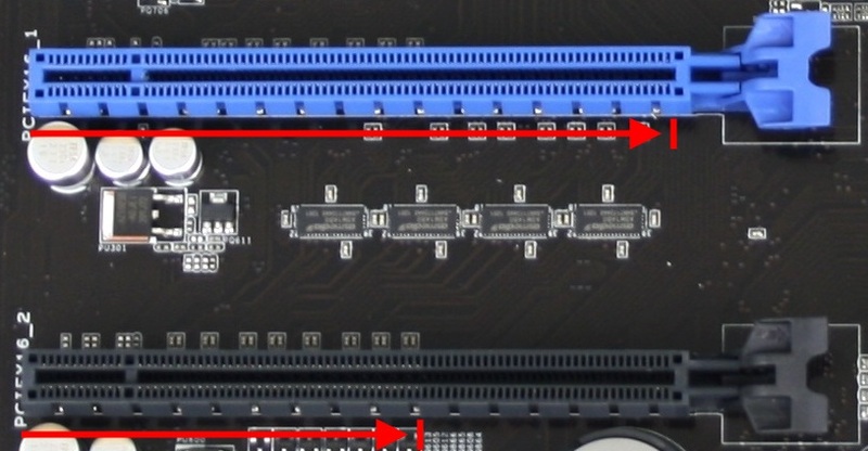 If documentation is not available, you can usually tell the actual speed of the slot by the number of pins in the slot itself. In the blue slot above, the pins go all the way across the slot, so it is a full-speed X16 slot. On the black slot, the pins stop about half-way, so this slot is actually an X8 slot in an X16 size.