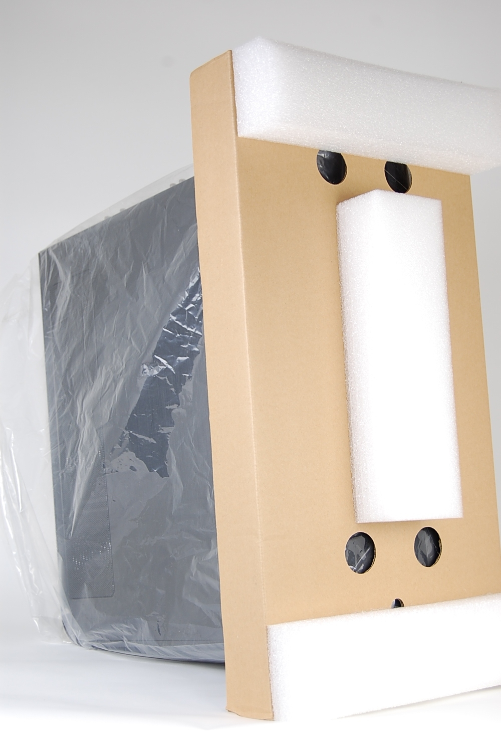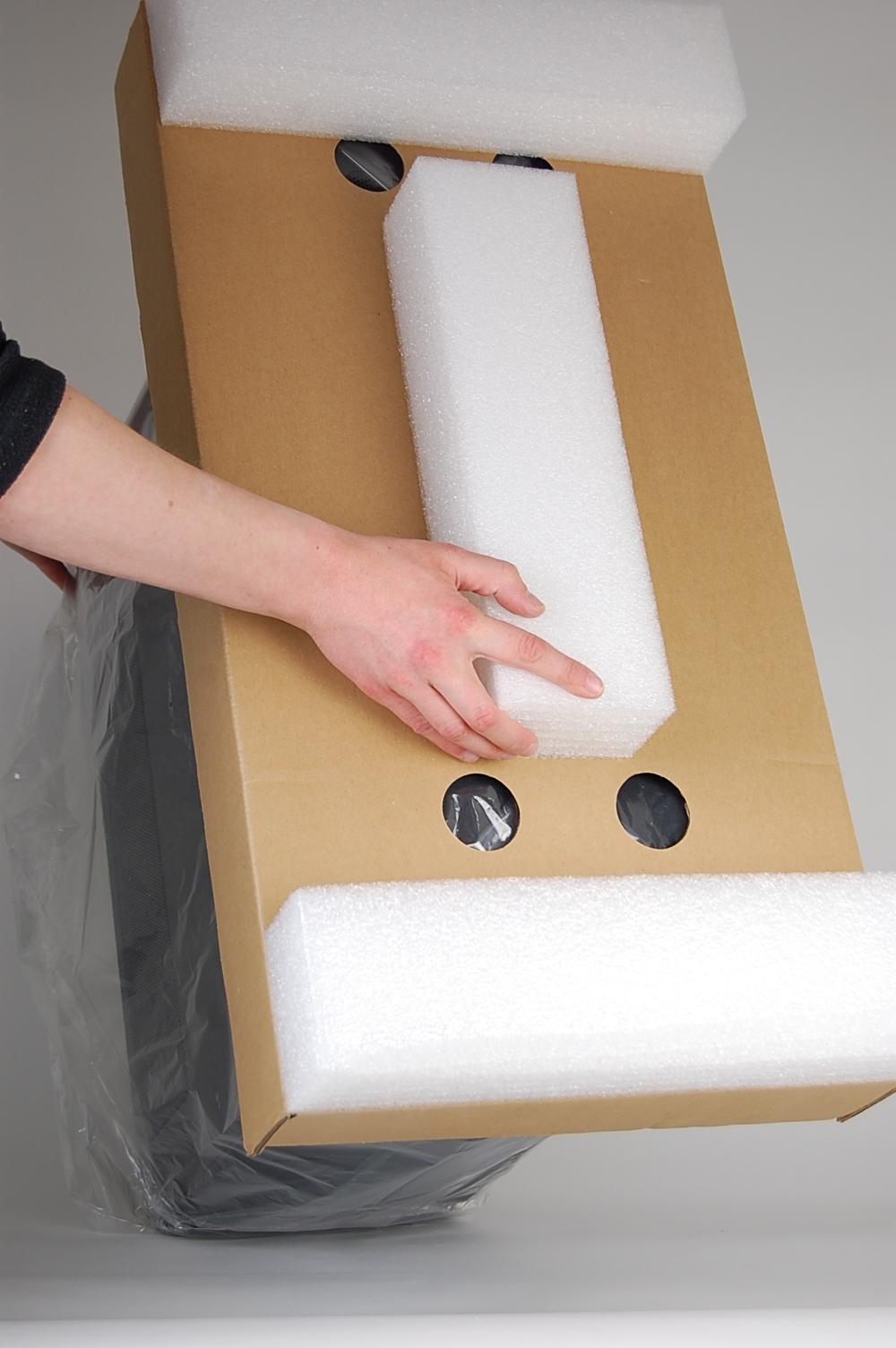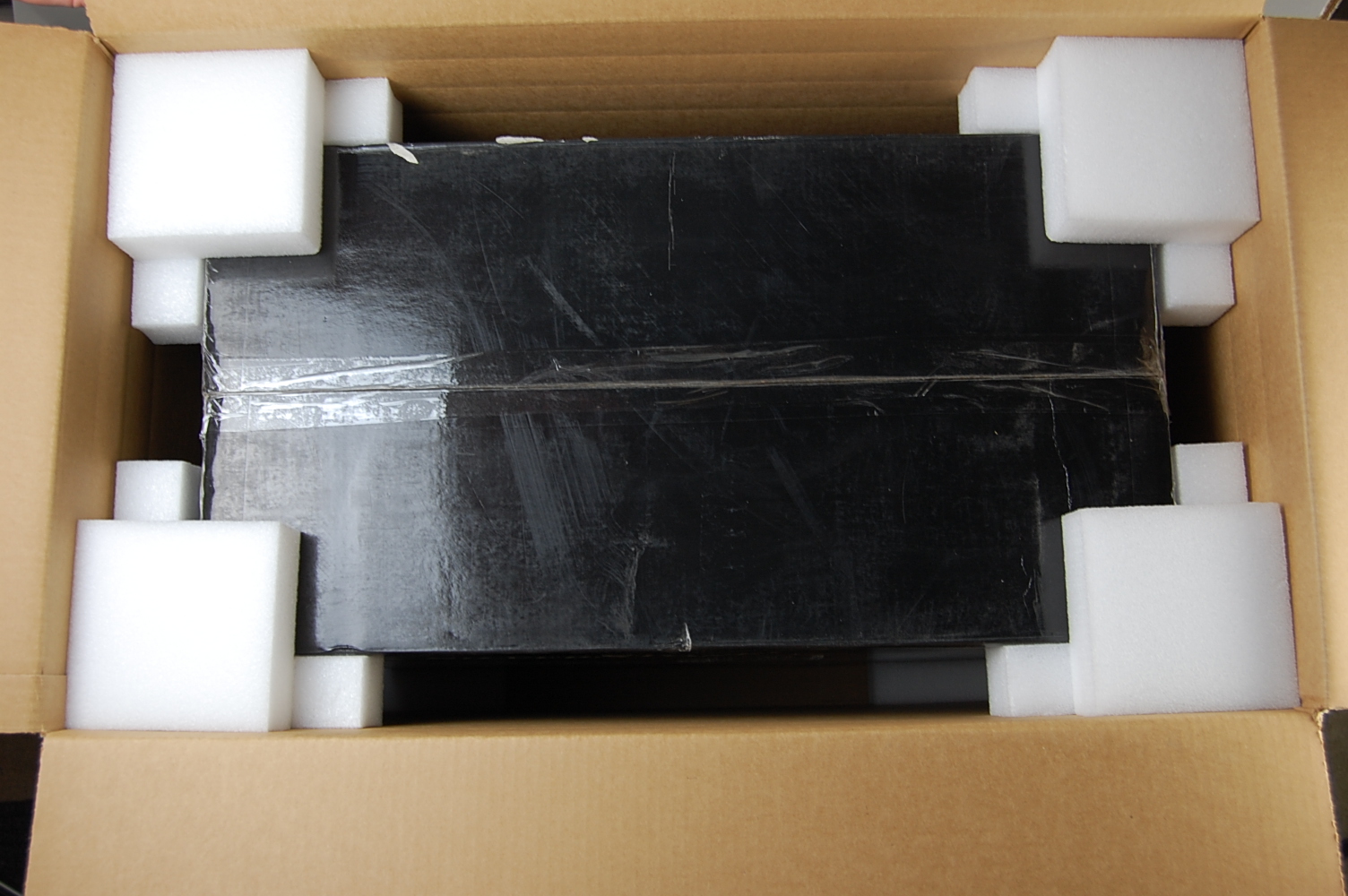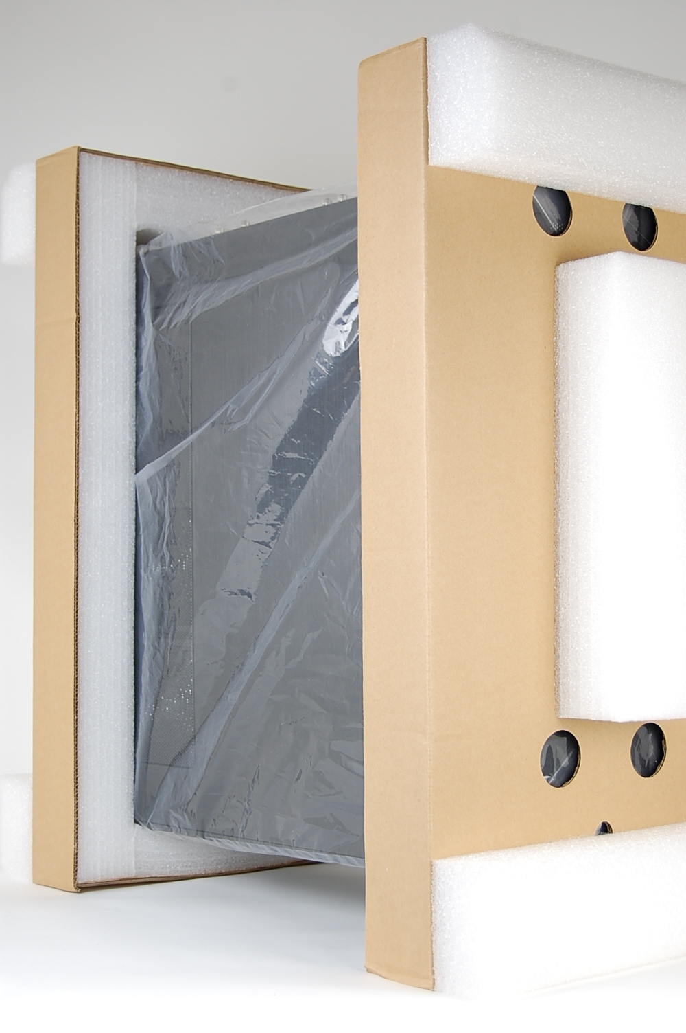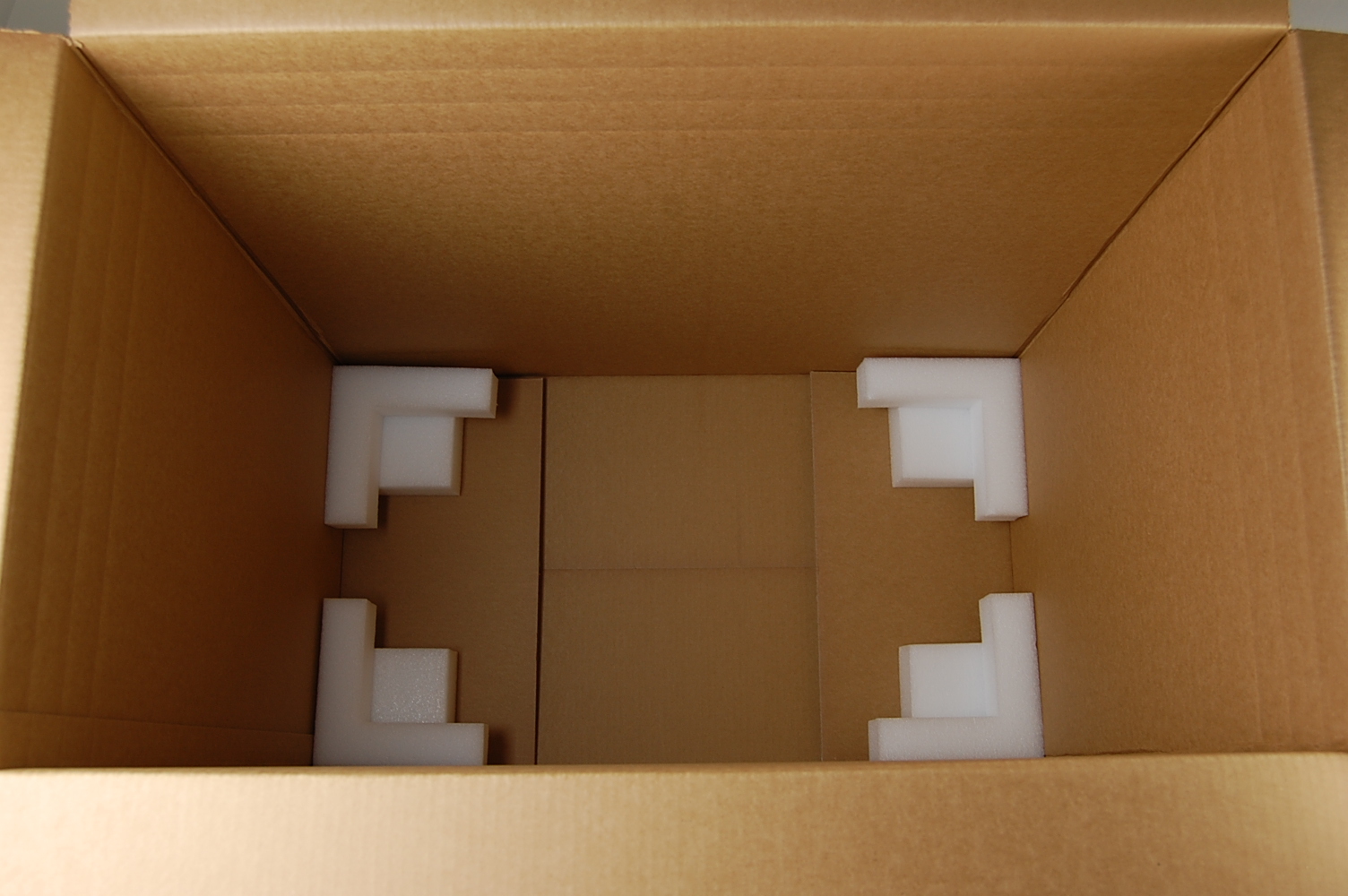 Put four foam corners in each corner of the outer box, making sure that the “L” side of the corner is facing up.