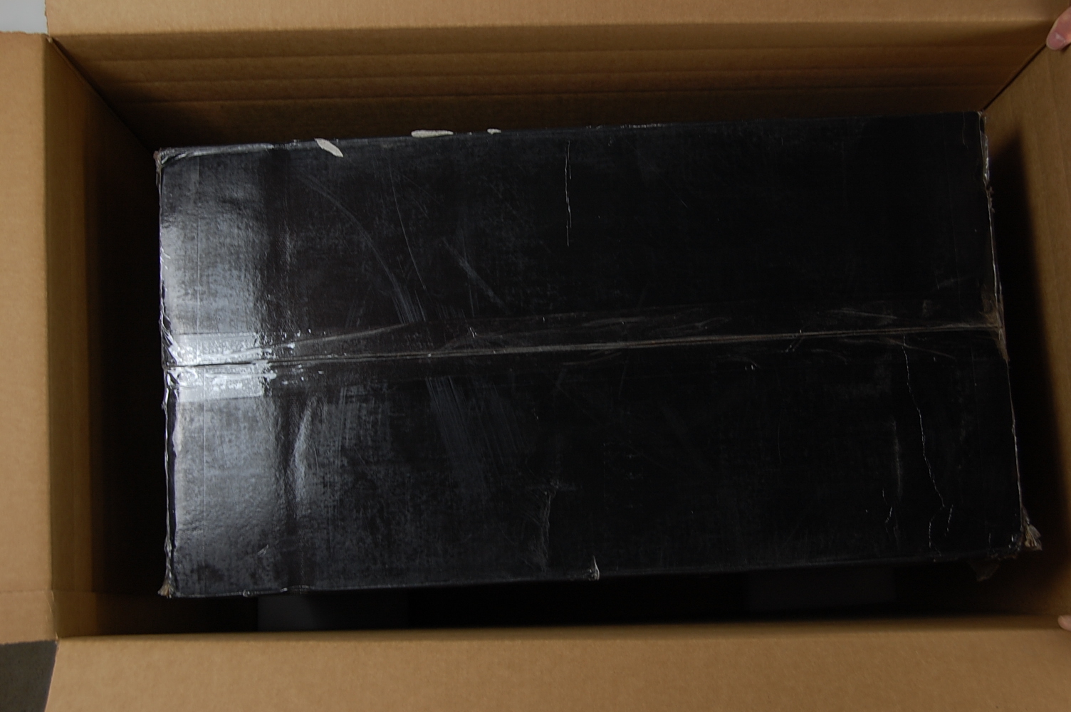 Use the remaining four corners to hold the computer in place, having the “L” side of the corner facing down. Tape the outer box shut. Secure the label on top.