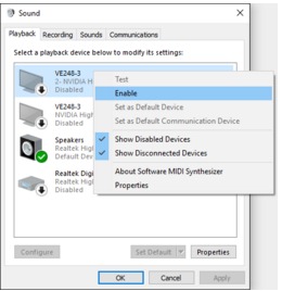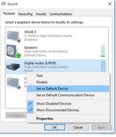 If the “Set as Default Device” option is grayed out and not clickable, you may need to first enable the device. To enable a device, you right click on the device and choose “enable”. This will then make the “Set as Default Device” option turn black and will allow you to choose it as an option.