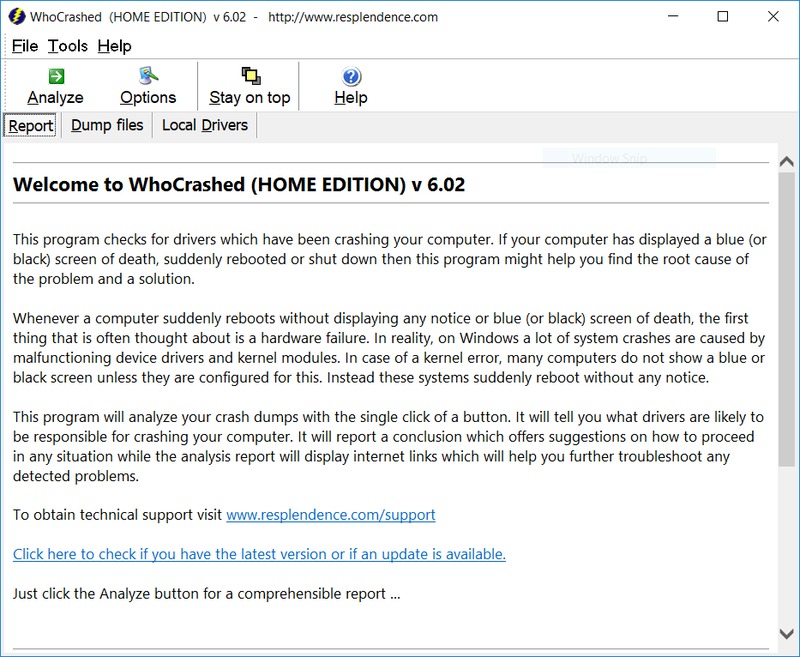 To use, simply click the "Analyze" button at the top left and scroll down to the bottom to review the dump report.