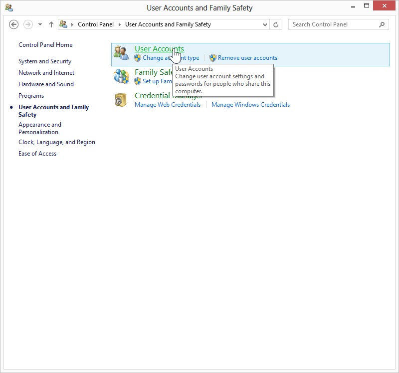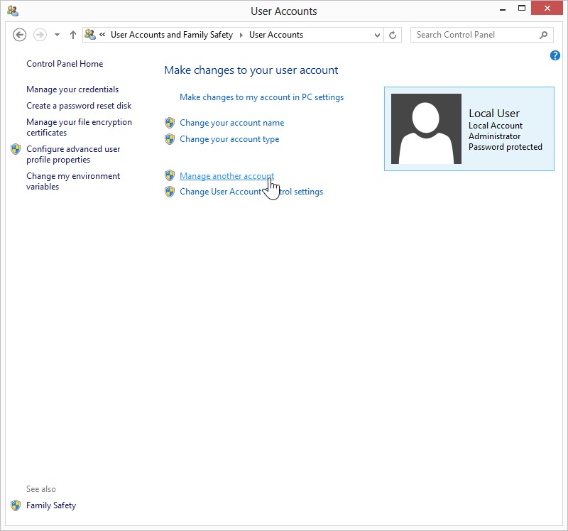 Accessing Control Panel -> User Accounts. Once you have done so, follow the steps below to access the advanced options for an account.