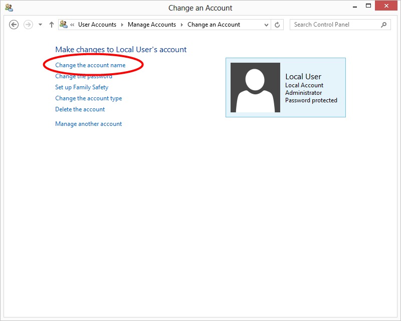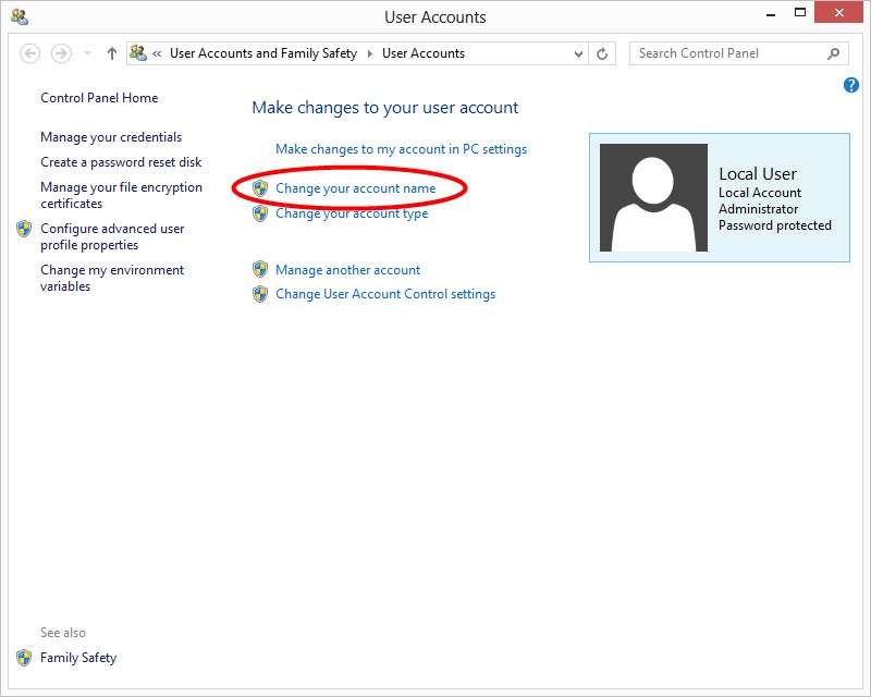 | Change Account Name: To change the user account name, click on "Change your account name" and input the desired account name. Note that if you are using a Microsoft account, this option is not available. To change the account name of a Microsoft account, you need to log in to your Microsoft account and change the name online. | ||