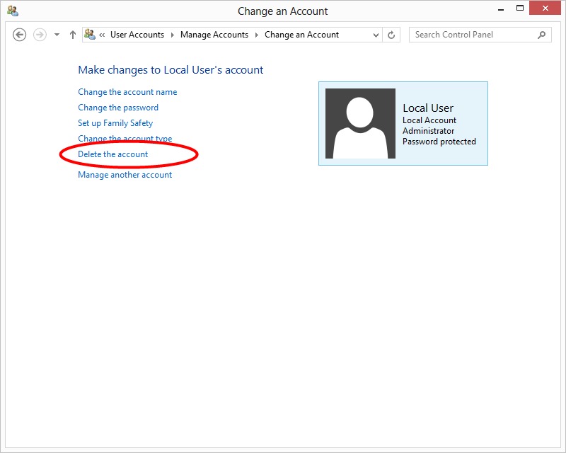 | Delete an Account: To delete an account, click on "Delete the Account". Note that this can only be done to other accounts and not the one currently logged in. So if you want to delete your current account, you will need to either log in to another account or create a new account with administrator privileges. | ||