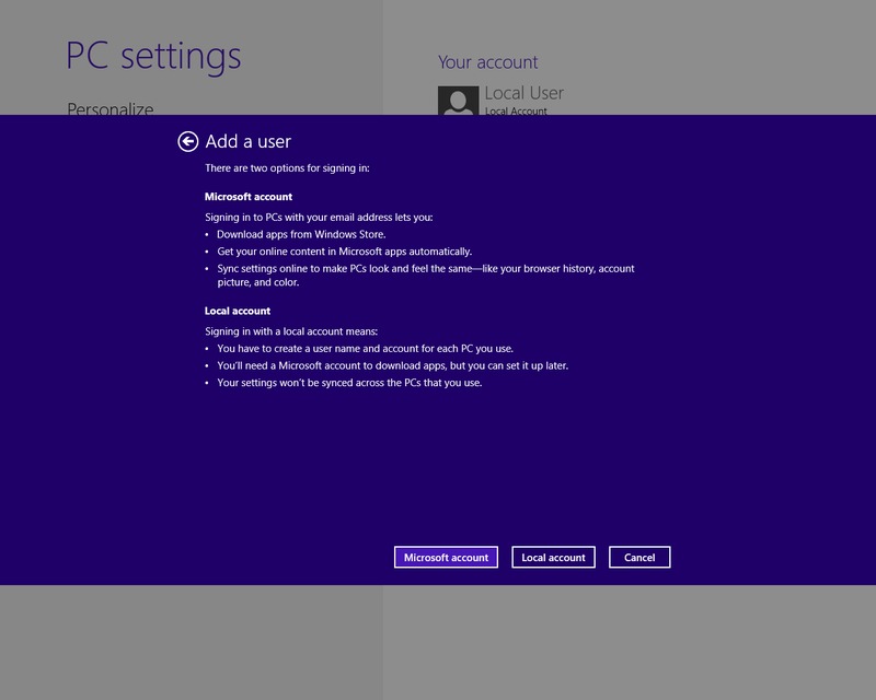 Out of all the options shown in the chart above, the only one that is not possible to directly achieve is adding an Administrator account. It is certainly still possible, but you need to first add a Standard account via the Start -> PC Settings, then go into the Control Panel -> User Accounts and change the account type to be an Administrator account.