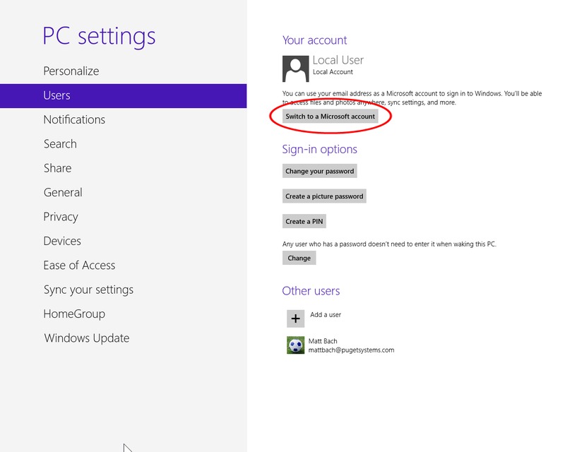 | Switch to Local/Microsoft Account: To change the logged in user to or from a Microsoft account, click on either "Switch to a local account" or "Switch to a Microsoft account" and follow the on-screen instructions. | ||