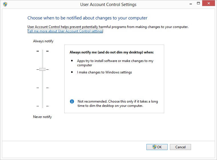 | Change UAC Settings: To change the UAC settings, click on the "Change User Account Control settings" and select the desired level of notifications. | ||
