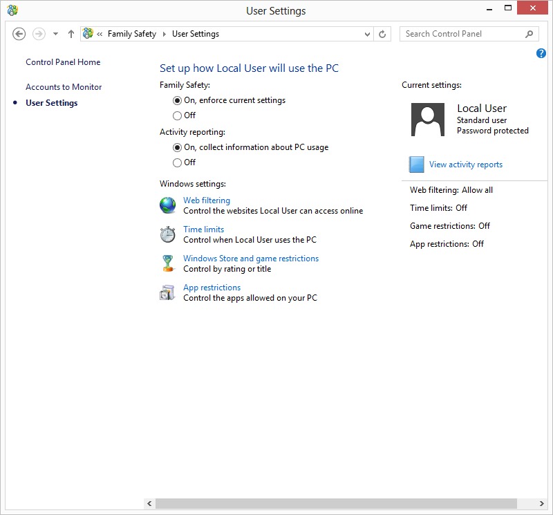 | Set up Family Safety: To configure the Family Safety settings, click on the "Set up Family Safety". Through Family Safety, you can get reports of user activities, set time limits, app restrictions and more. | ||