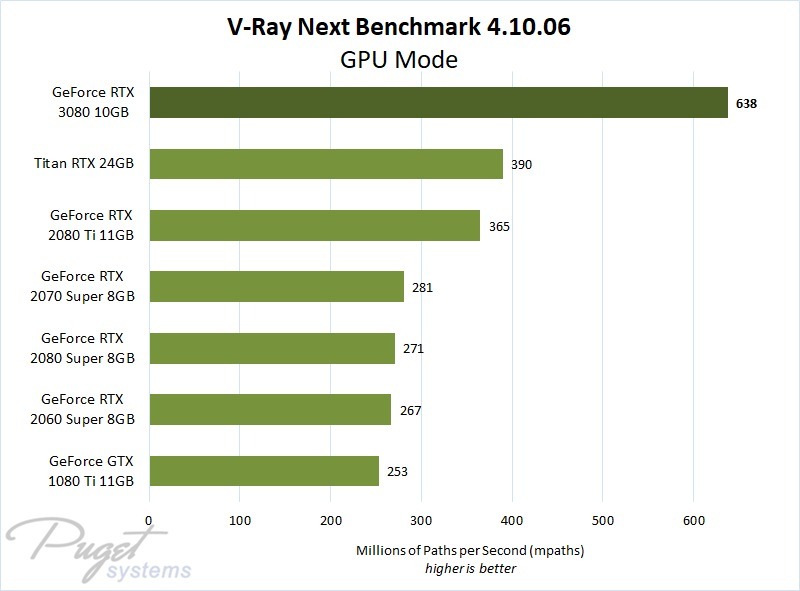 Summary: If you are operating on a budget, or only have room for a single video card in your workstation, then the GeForce RTX 3080 is a great GPU for rendering in V-Ray and V-Ray Next. It has the best single-card performance we've yet tested (though it is certain to be outdone by the RTX 3090 later this month) and 25% more video memory than previous-gen models at the same price point.