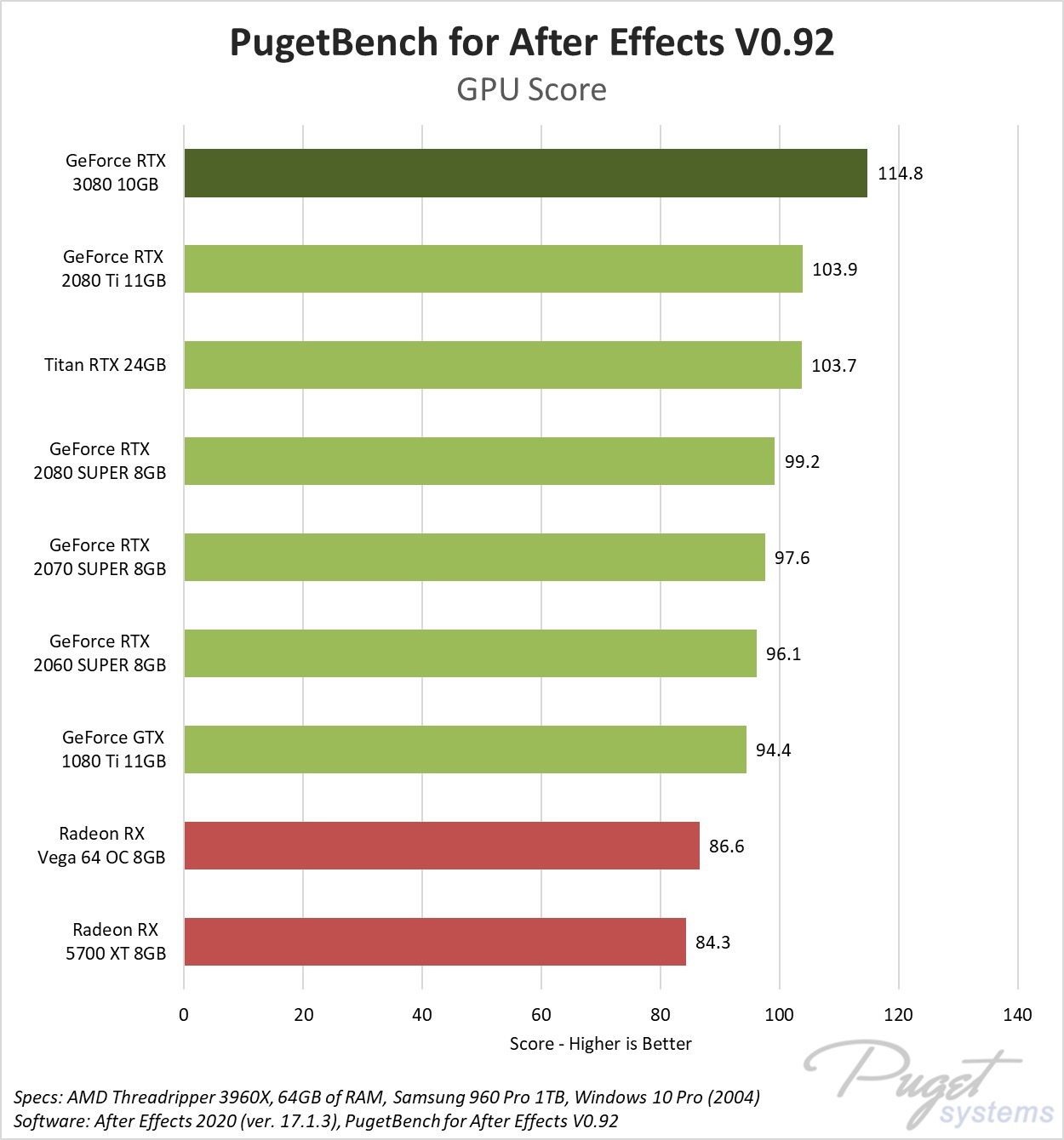 Summary: For most users, After Effects is going to be CPU bottlenecked long before the performance of your GPU comes into play. However, in certain After Effects workloads, the new GeForce RTX 3080 is around 11% faster than the previous generation RTX 2080 Ti, 16% faster than the RTX 2080 SUPER, or a bit more than 20% faster than the older GTX 1080 Ti.