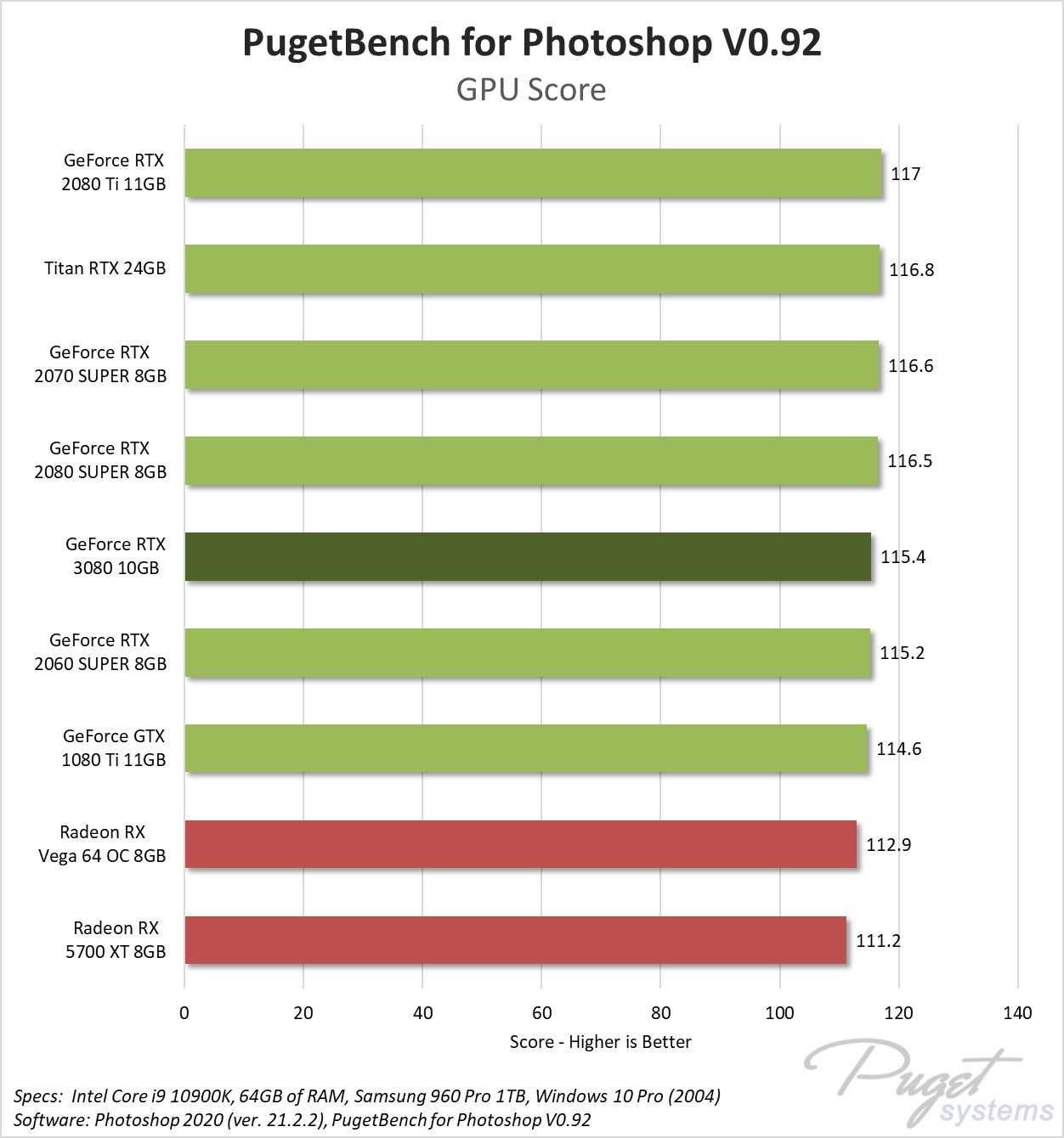 Summary: Although Photoshop has a number of GPU-accelerated effects that make it important to have a supported GPU, there was effectively no difference in performance between the various NVIDIA and AMD GPUs we tested. The new NVIDIA GeForce RTX 3080 10GB performs just fine, but it is no faster than the RTX 2080 Ti, not to mention the RTX 2060 SUPER or even the older GTX 1080 Ti.