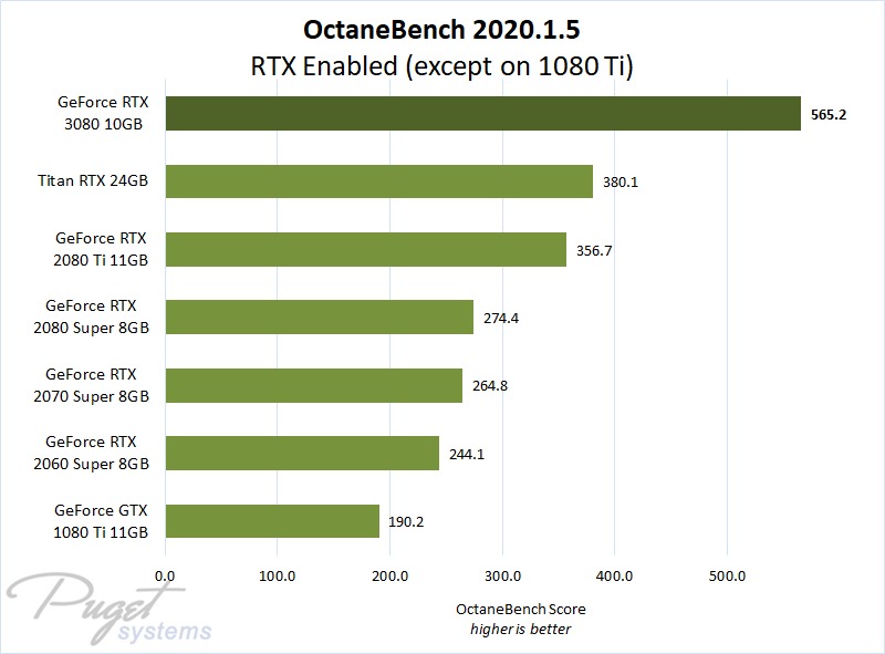 To see how the new GeForce RTX 3080 10GB performs in real-world scenarios, we have reviews looking at a number of applications across rendering, game development, the Adobe Creative Cloud suite, and more. While this post includes a summary for each entry, we highly recommend reading the full article for programs you are interested in as we go into much greater detail in the individual reviews.