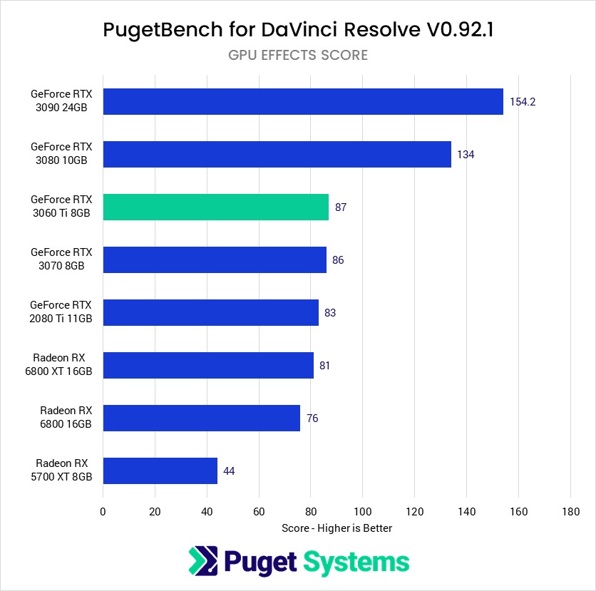 Summary: Overall, the new NVIDIA GeForce RTX 3060 Ti is a very solid GPU for DaVinci Resolve. At most, the RTX 3060 Ti trails the RTX 3070 by just 8%, but can be as much as 2x faster than the AMD Radeon 5700 XT. This also makes the RTX 3060 Ti faster than any AMD GPU we have tested to date, besting even the Radeon 6800 XT which costs significantly more. This makes it a terrific option for those on a tighter budget.