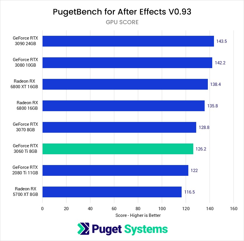 Summary: For most users, After Effects is going to be CPU bottlenecked long before the performance of your GPU comes into play. But in situations where the GPU is being heavily used, the new NVIDIA GeForce RTX 3060 Ti 8GB can be around 8% faster than the Radeon 5700 XT 8GB in After Effects. It is also only slightly slower than the more expensive RTX 3070 8GB, making it a great way to save a bit of money so you can invest more into your CPU or RAM.