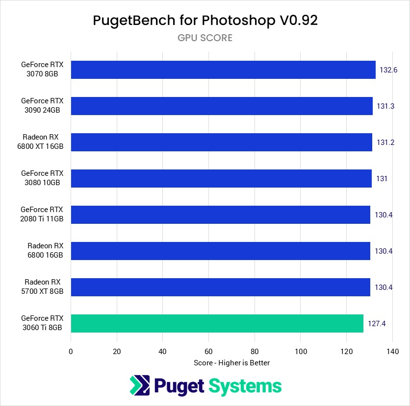 Summary: The NVIDIA GeForce RTX 3060 Ti 8GB consistently ended up at the bottom of our charts – although since it ties with the Radeon 5700 XT as the least expensive GPU we tested, this is largely to be expected. Even then, however, it is very important to note that all the cards we tested performed within the margin of error for our Photoshop benchmark. So, while the RTX 3060 Ti is most likely not quite as good as a more expensive GPU, the difference isn't definitive and is going to be impossible to notice in your everyday work.