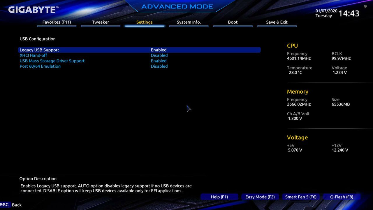 - Legacy USB Support – By default we set this to Enabled but you can try setting to disabled and most devices will still work normally but the system may boot a little faster