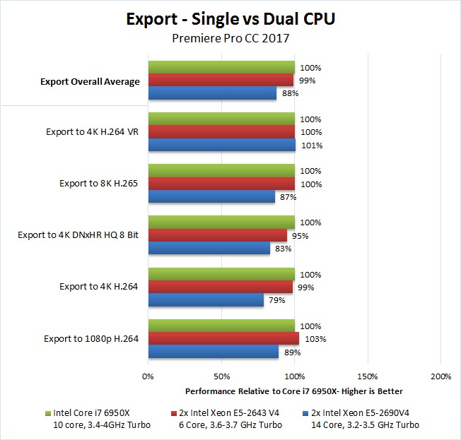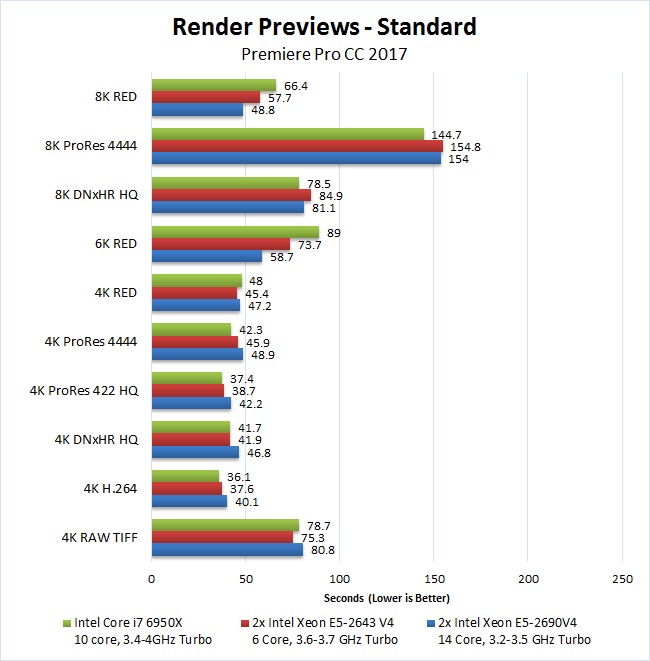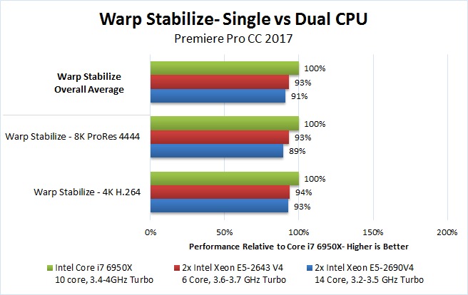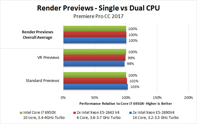Even ignoring the price aspect, we rarely saw any benefit to using either of the dual Xeon CPUs we tested over the Core i7 6950X. There were a few times where rendering previews was faster (6K/8K RED) but for the other previews, exporting, warp stabilize, and even live playback performance going with the Core i7 6950X is clearly a better choice.