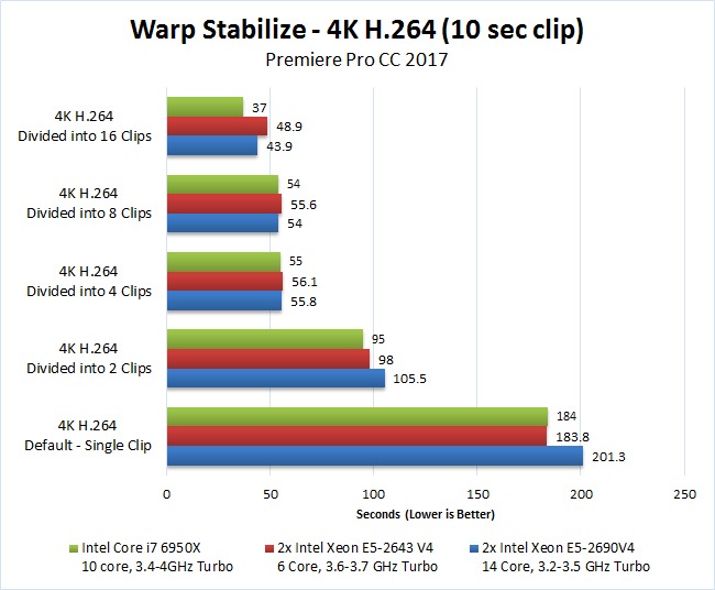 Since warp stabilize is not well threaded (it does not take great advantage of multiple CPU cores), one method people use to decrease the time it takes to complete the analysis is to split their clip into multiple parts and analyze all of them at the same time. This essentially forces Premiere to make more effective use of all the CPU cores in your system. Since this is trick employed fairly commonly, we decided to not only time how long it takes to apply a warp stabilization effect to a single 10 second clip, but also how long it takes if the clip is split into 2, 4, 8, and 16 "sub-clips" that are all analyzed at the same time.