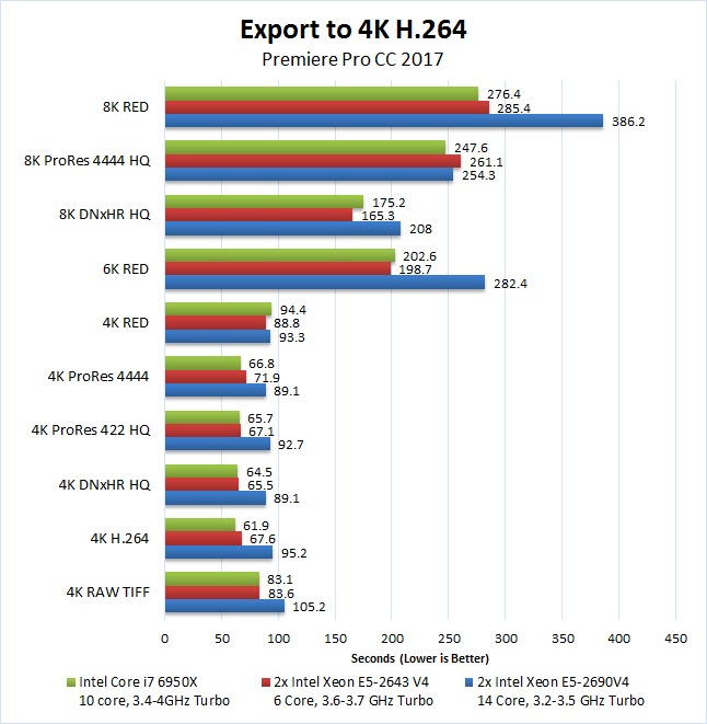 Considering that a Core i7 6950X workstation should be around $1,500 cheaper than a similarly specced workstation with dual Xeon E5-2643 V4 CPUs, and almost $4,000 cheaper than a 2x Xeon E5-2690 V4 system, we see absolutely no reason to recommend a dual Xeon workstation for Premiere Pro. A single CPU system will be overall faster, much more cost effective, less complicated (which means more reliable and more consistent performance across various applications), quieter, and can be physically much smaller. In the past there used to be an argument for dual Xeon due to the higher RAM and PCI-E card capacity, but today one of our Core i7 6950X workstations can be configured with up to 512GB of RAM and four GPUs – both of which are frankly overkill for Premiere Pro.