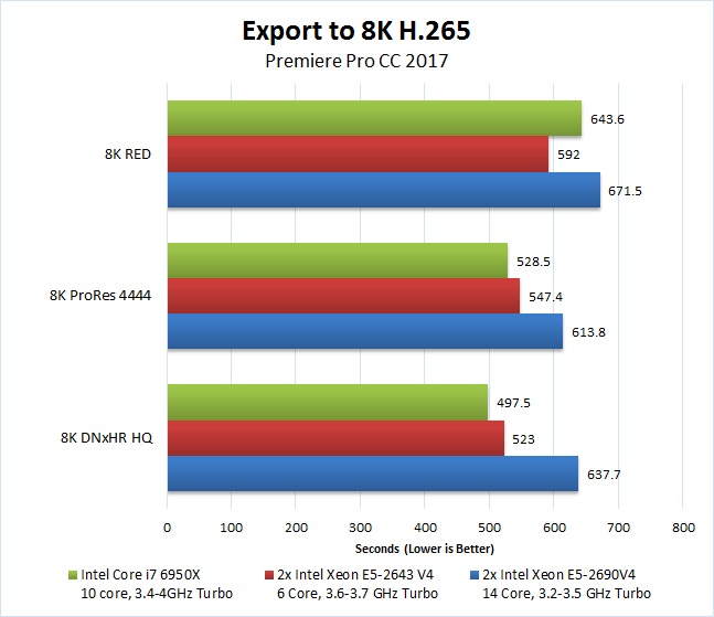 The exact amount of performance difference changes based on the resolution and the number of "sub-clips" you create, but compared to the i7 6950X, the 2x E5-2643 V4 ranges from matching the Core i7 6950X to being 24% slower. For the 2x E5-2690 V4, it was anywhere from the same as the Core i7 6950X to 16% slower. If you take all of this as an average, the Core i7 6950X comes in at about 7% faster than the 2x E5-2643 V4 and 9% faster than the 2x E5-2690 V4.