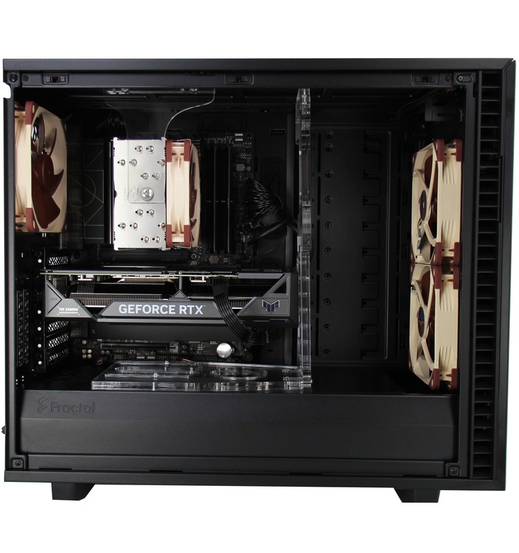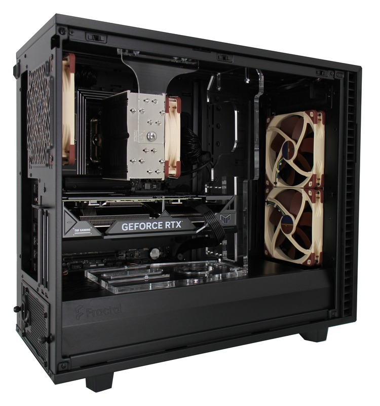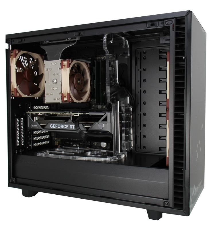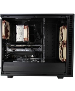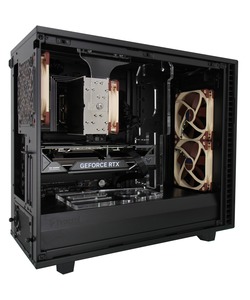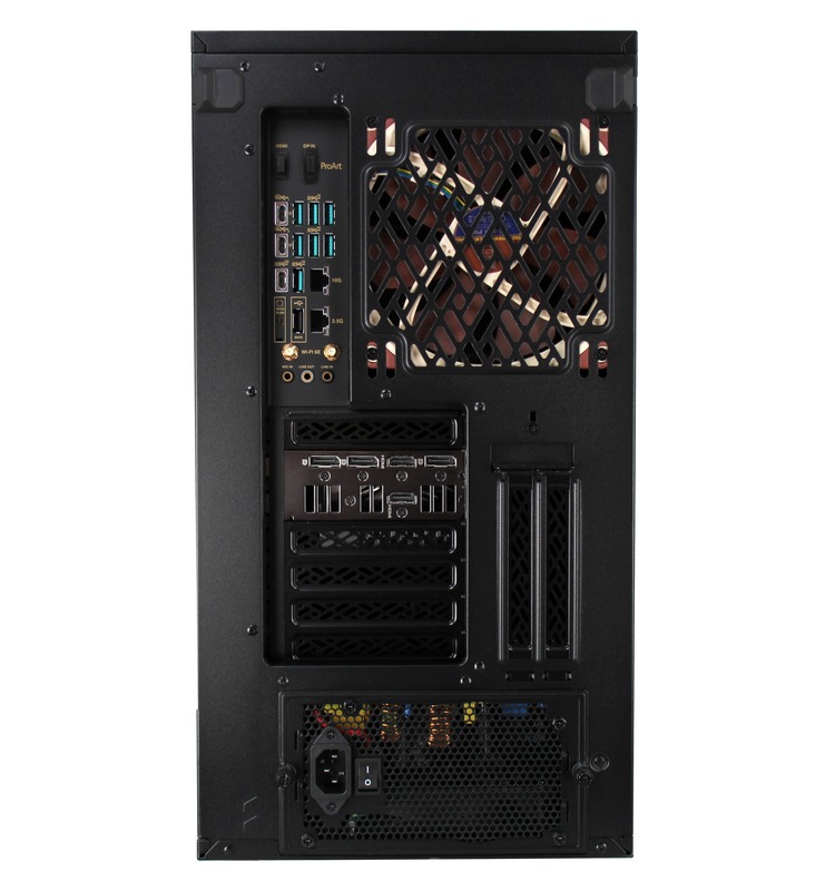 This system is built in the Fractal Design Define 7 case, which has USB and audio ports along the top front edge, while the motherboard’s rear I/O panel provides more USB ports, additional audio connectivity, and both Ethernet and WiFi for networking. A range of upgrade and add-on options are also supported – including dual video cards, up to 192GB of memory, and multiple solid-state and hard drive configurations. There are also plenty of fans to keep components cool, with filters over the air intakes to reduce dust buildup.