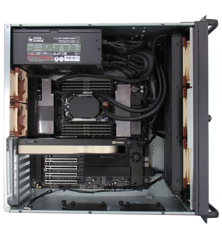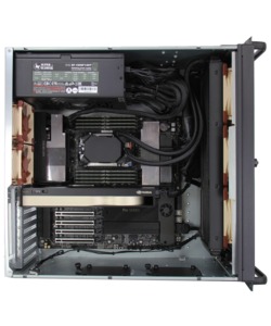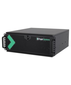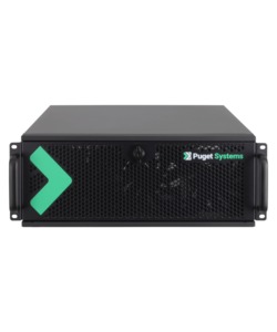 AMD’s Threadripper PRO 7000WX is ideal for applications which need both a lot of cores and high memory capacity / bandwidth. This system is built in a 4U chassis with three USB ports on the front, including one Type C, while the motherboard’s rear I/O panel provides the bulk of the connectivity (more USB, audio, and networking). Internally there is a lot of space, supporting a wide range of options including up to three video cards, up to 1TB of DDR5 memory, and multiple solid-state and hard drive configurations. There are also powerful fans to ensure everything stays well cooled, but without the noise-dampening features a tower workstation can offer.