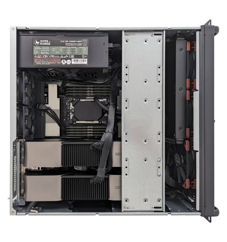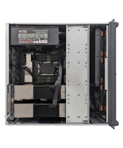 This 4U rackmount workstation features AMD’s Threadripper PRO 7000WX processors with up to 96 cores and 1TB of DDR5 in a spacious chassis.