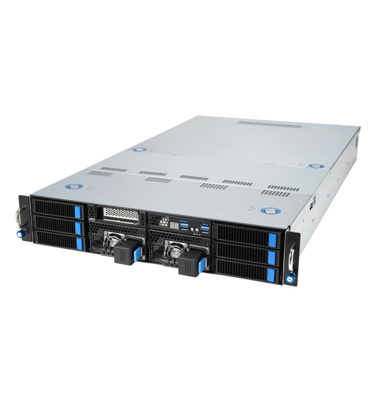 AMD’s EYPC line of processors are built for demanding server workloads, offering up to 128 cores with support for 12 DDR5 memory channels and 128 PCIe Gen 5 lanes. This server uses that processor to enable up to four dual-width GPUs in a compact 2U chassis. Several hot-swap drive bays are easily accessible on the front, along with redundant power supplies and four USB ports. Additional USB ports and networking jacks are located in the rear.