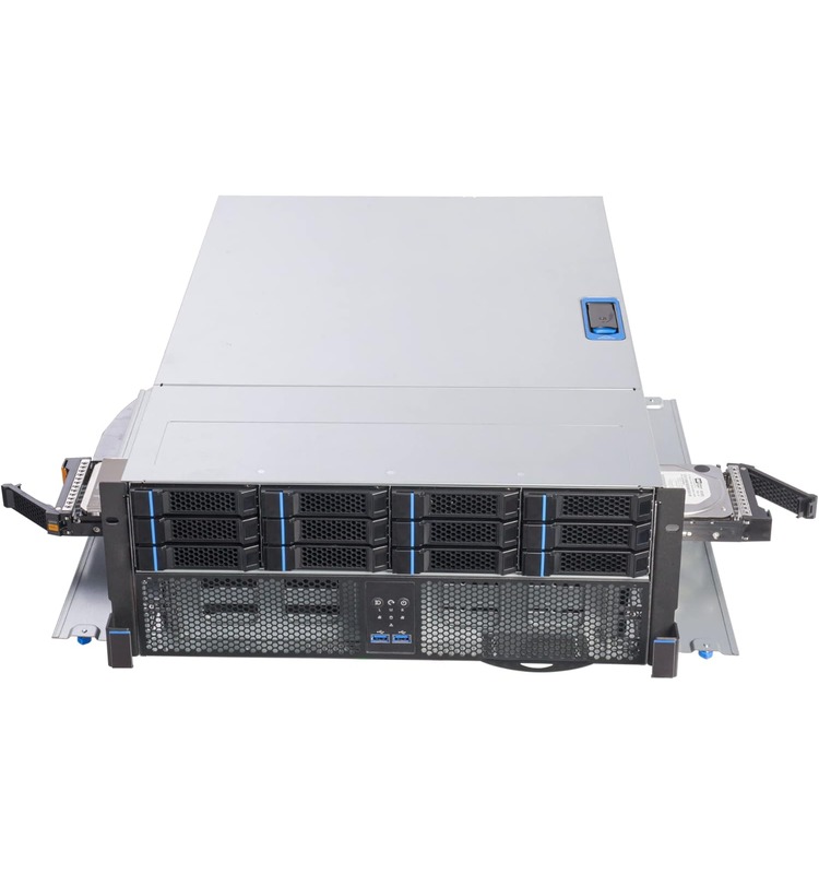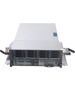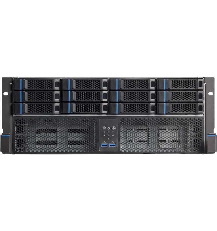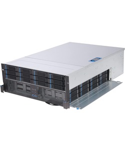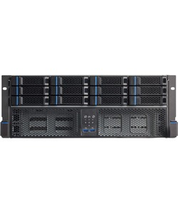 Powered by OSNEXUS QuantaStor, running on AMD’s EYPC 8004 line of processors, this server provides a software-defined storage system with up to thirty-six 3.5-inch hot-swap drive bays in a large 4U chassis. Mirrored OS and metadata offload drives are also present, as well as redundant power supplies and various networking options.